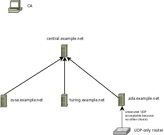 In this step, we configure a client machine. We from our scenario, we use zuse.example.net. You need to do the same steps for all other clients, too (in the example, that means turing.example.net). The client check’s the server’s identity and talks to it only if it is the expected server. This is a very important step. Without it, you would not detect man-in-the-middle attacks or simple malicious servers who try to get hold of your valuable log data.
